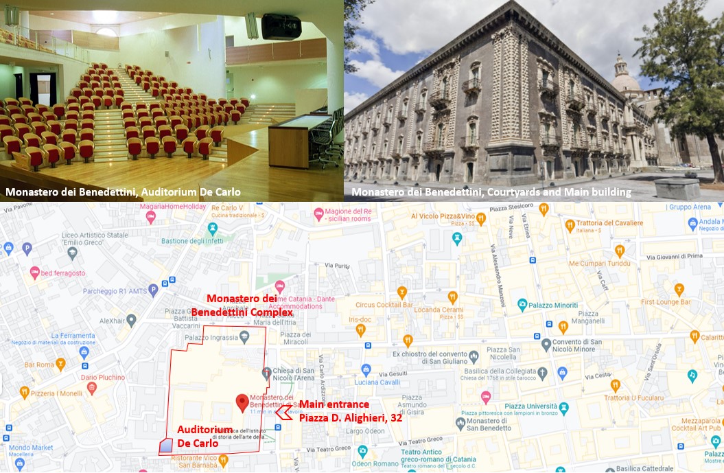 The workshop will be held in the "Auditorium De Carlo" of the “Monastero dei Benedettini”. Outside, the Auditorium de Carlo looks like a simple volume with an almost squared plan layout, but inside it offers a dynamic and polycentric space. The event can take place on three different points of view at different levels. It can take place using one point of view or the other, or two, or all of them simultaneously. The armchairs (“xenitia”) with beech plywood shells (designed by Giancarlo De Carlo) can rotate to allow visibility for more than 200 degrees. This offers to odiens and speakers a dynamic spatial perception that wants to be the physical representation of the common root of the themes of EWICS, irregularity/complexity of structures subjected to seismic excitation. The "Monastero dei Benedettini" is one of the largest Monastery of Europe. The history of this jewel of the late Sicilian Baroque is symbiotically related to that of Catania. They share the same resilience against the two last natural calamities, the lava eruption of 1669 and the earthquake of 1693, when they were both destroyed and proudly rebuilt. The site of the Workshop (Monastero dei Benedettini) is located in the city centre and may be easily reached by bus, subway or taxi. The main entrance of the monastry complex is located in Piazza Dante Alighieri, 32 (see it in the map reported below or locate it by GoogleMap).
